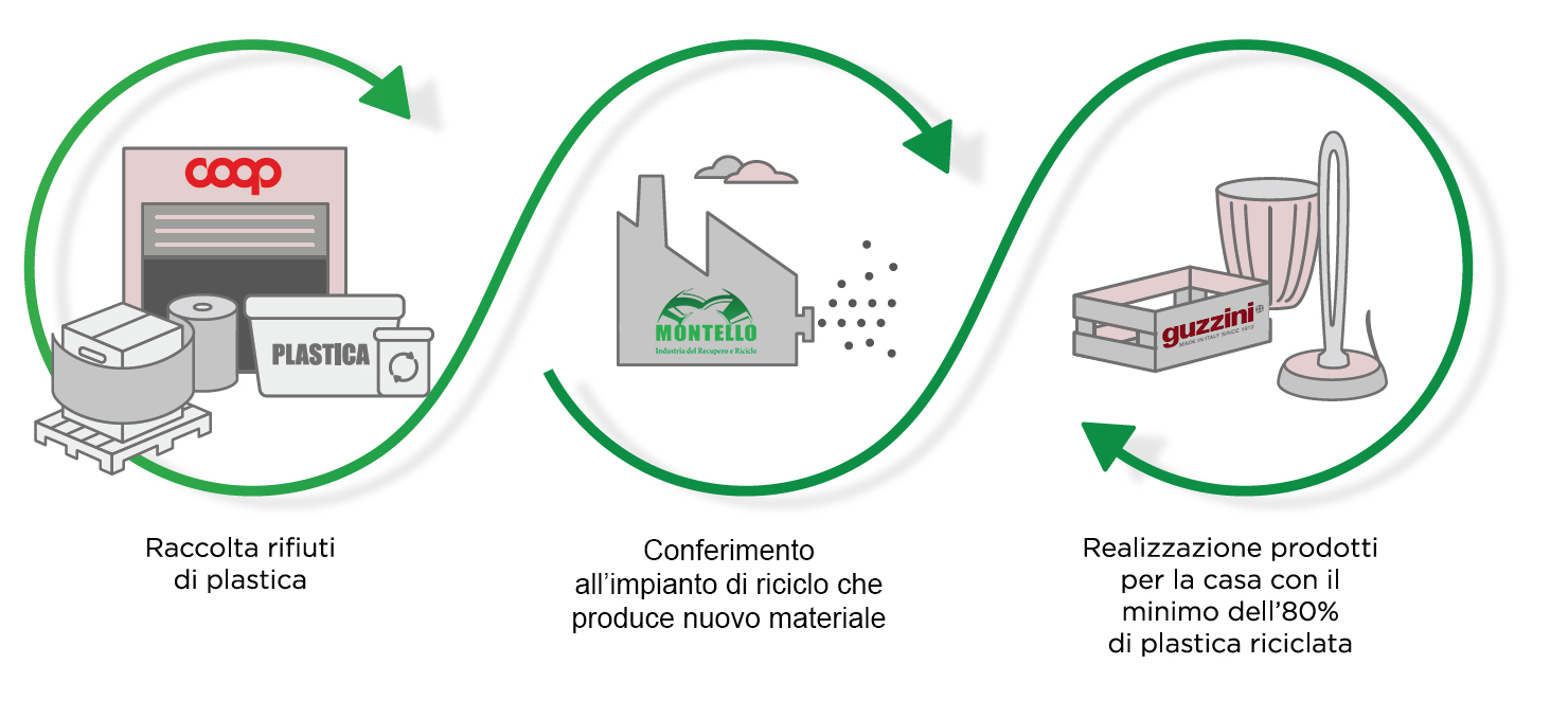 Quando si dice plastica post-consumo (PCR) selezionata e riciclata in Italia, si dice Montello. Coop, infatti, ha scelto l’impianto bergamasco per far conferire i rifiuti provenienti da alcuni dei suoi magazzini e punti vendita. In Montello avviene il riciclo e la trasformazione in materie prime seconde (MPS) certificate e pronte ad essere a loro volta trasformate in nuovi manufatti. Questa collezione di utensili da cucina è prodotta da Guzzini in esclusiva per Coop, perché scegliere il riciclato non significa dover rinunciare né alla qualità né al design.